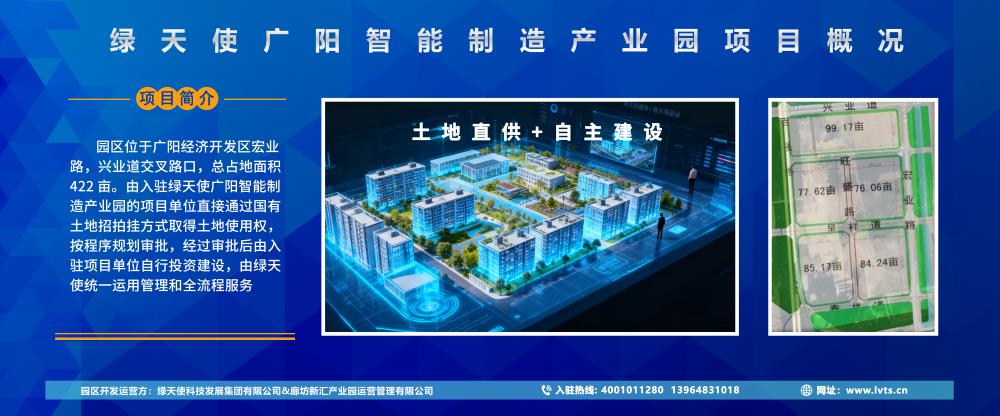 绿天使(广阳)智能制造产业园,位于广阳经济开发区宏业路,兴业道交叉路口,总占地面积422 亩。由入驻绿天使广阳智能制造产业园的项目单位直接通过国有土地招拍挂方式取得土地使用权,按程序规划审批,经过审批后由入驻项目单位自行投资建设,由绿天使统一运用管理和全流程服务。