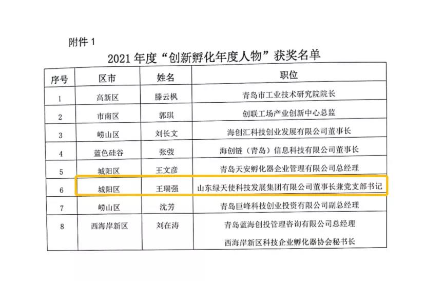 近日,青岛市科技企业孵化器协会公示了2021年度青岛市创新孵化先进评选结果,绿天使获多项殊荣,其中:绿天使环保创业园荣获“创新孵化先进机构”奖,山东绿天使科技发展集团有限公司董事长王瑞强荣获“创新孵化年度人物”奖,副总经理陈聪聪荣获“创新孵化先进工作者”奖。