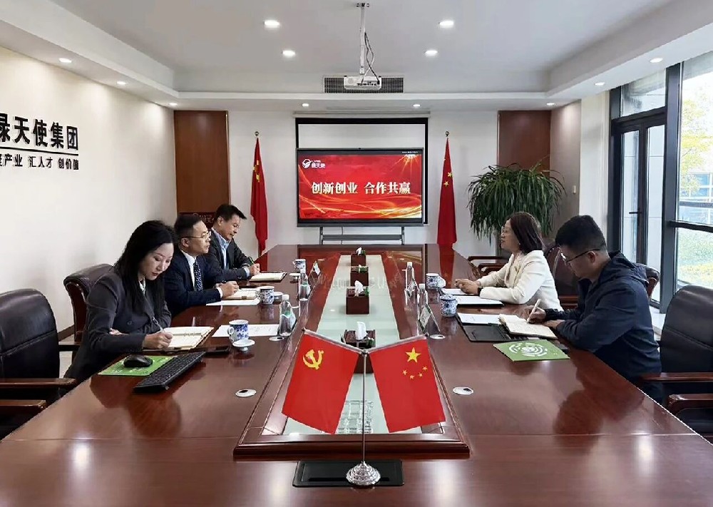 近日,四川省遂宁市蓬溪县县长吴红彬、副县长赵伶莉、经开区党工委书记何均红等一行来访绿天使集团参观交流,绿天使集团副总裁李秀娣、副总经理黄岩、产业发展事业部招商经理丁峰等人予以热情接待。 李秀娣副总裁对吴红彬县长一行的来访表示热烈欢迎,并详细讲解了绿天使集团的发展历程、园区概况、运营