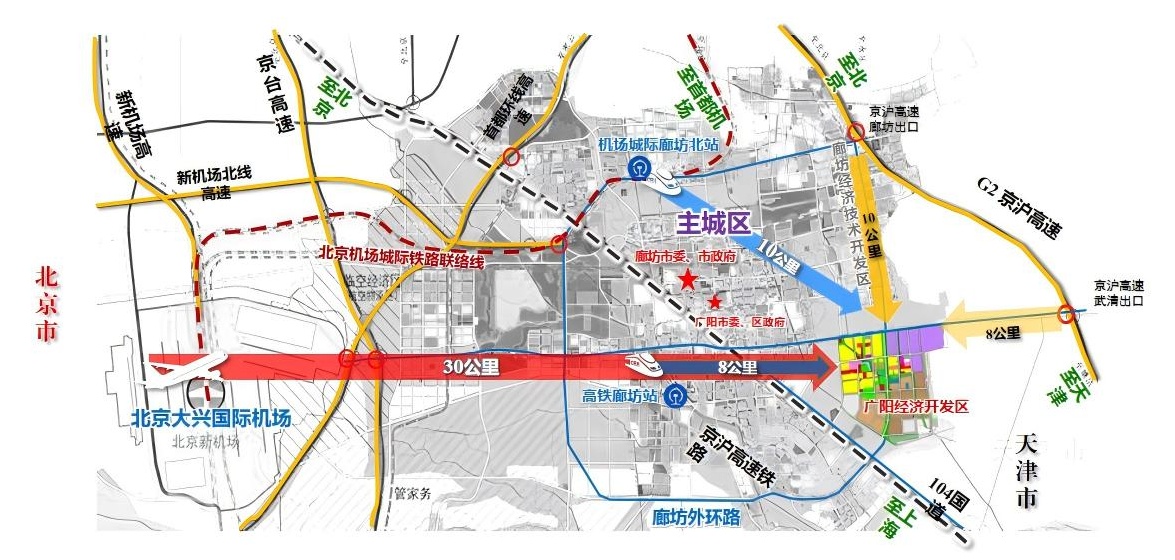 园区距北京天安门 40 公里、天津市区 60 公里,是京津冀 “一小时通勤圈”的核心节点;区域内已形成 “五纵三横” 高速公路网(京台、京沪、京津塘、首都环线、津石高速等)、京沪高铁、京津城际铁路等铁路干线,100 公里范围内覆盖北京大兴国际机场、首都机场、天津滨海机场三大国际空港及天津港、唐山港两大港口。