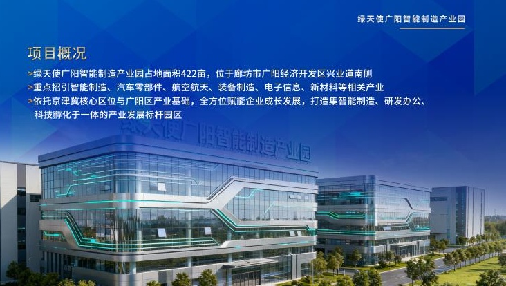 绿天使(广阳)智能制造产业园依托广阳区位与产业基础,构建“自然生态、产业生态、资源生态协同发展的智能产业生态圈,打造京津地区智能制造示范基地。立足广阳,服务京津。 依托北京“中国药谷”的研发资源与天津、河北的产业基础,重点承接科技成果转化与产业链配套环节,构建协同发展的生命大健康产业集群。