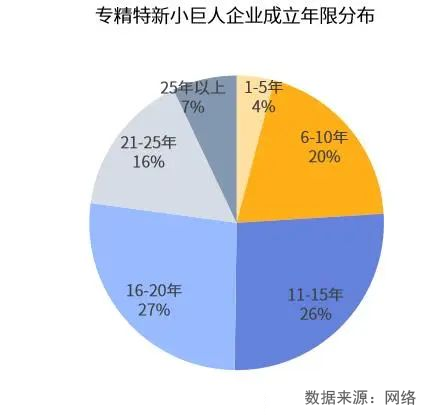 专精特新小巨人企业平均成立年限为16年,成立年限在10年及以上企业占比达到80.3%,其中成立年限在11-15年、16-20年的企业分别占比26%、27%。