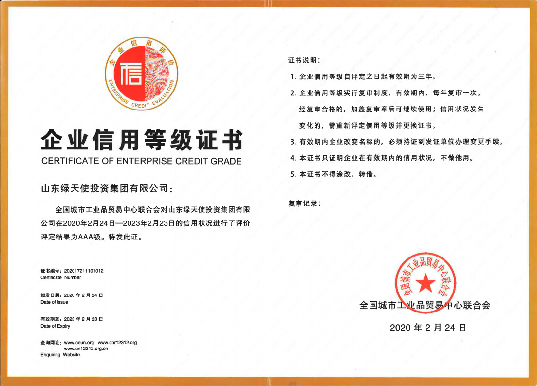 为加强企业的诚信建设,推动行业自律,近日,山东绿天使投资集团有限公司完成了AAA信用体系申请认定各项工作,并获得由国家商务部和国务院国资委授权国家一级行业协会颁发的企业信用评级AAA等级认定资质。
