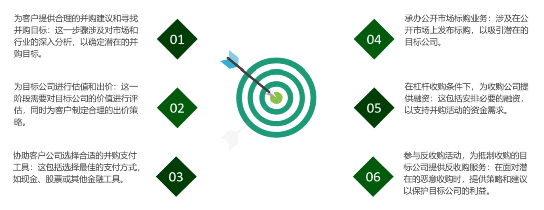 绿天使服务团队投资并购服务主要包括为客户提供合理的并购建议和寻找并购目标、为目标公司进行估值和出价、协助客户公司选择合适的并购支付工具、承办公开市场标购业务、在杠杆收购条件下为收购公司提供融资、参与反收购活动,为抵制收购的目标公司提供反收购服务。 这些服务涵盖了并购过程的多个关键环节,确保并购活动的顺利进行和成功完成。