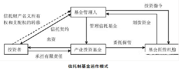 契约型产业投资基金是根据一定的信托契约组织的代理投资行为,一般由受托人(基金管理公司)、基金保管机构和作为受益人的投资者三方订立信托投资契约。契约型产业投资基金普遍形成了典型的“三权分立”的治理机构形态:投资者作为基金资本所有权人,投资后以持有人(委托人)的身份存在;产业投资基金受托人(基金管理公司)以受托人的身份行使基金的经营管理权;托管人行使基金财产的保管与监督权。